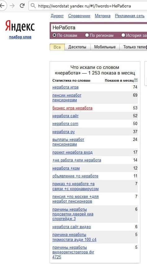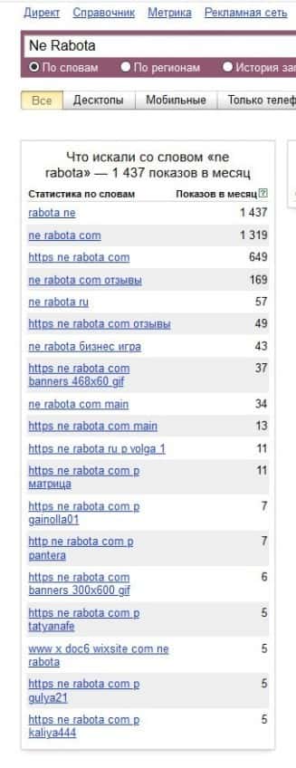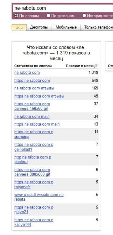 Полное название домена "ne-rabota.com" было не менее попуярным - около 1390 запросов и это только за месяц.