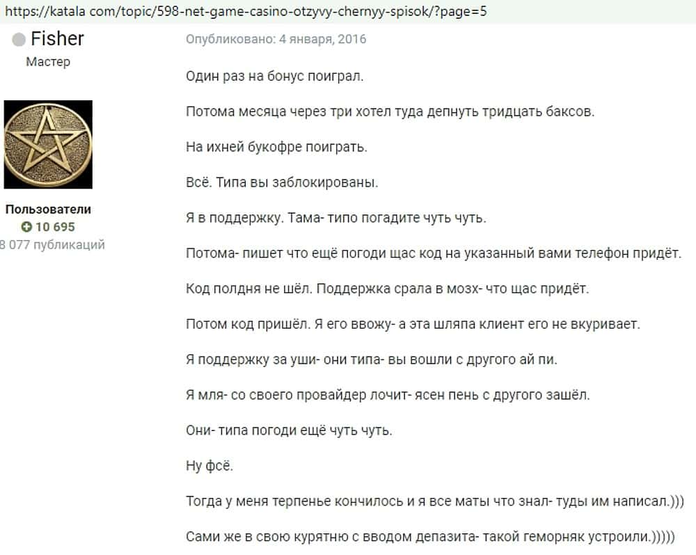 Когда пользователь честно отыграл предложенный ему бонус и попросил вывода части средств, кидалы Нетгейм Казино просто начали его игнорировать и заблокировали аккаунт.