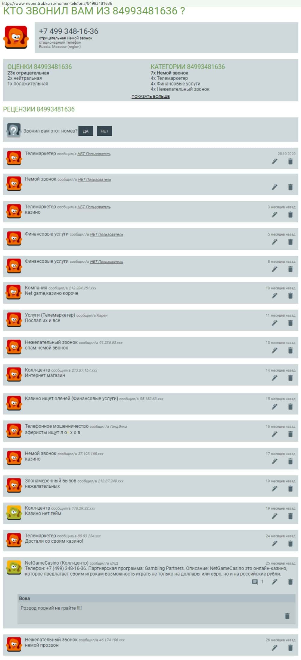 - Кто звонил: +74993481636 - МОШЕННИКИ Нетгейм Казино