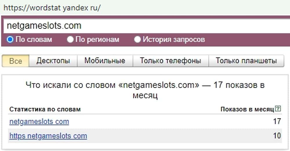 Доменное имя деревянного игрового блошатника "netgameslots.com" искало за месяц очень немного человек. Всего 17 показов в поисковой выдаче Яндекс получил сайт-шарлатанство.