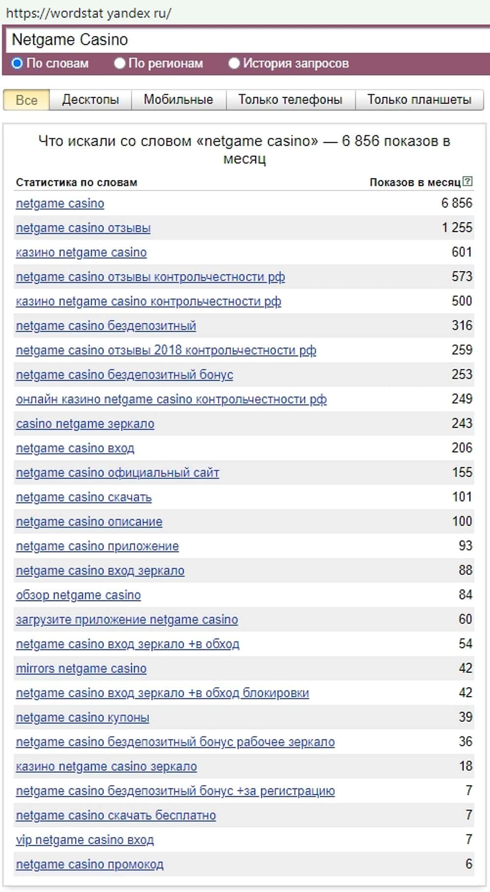 А вот бренд разводняка "Netgame Casino" стал довольно популярен у пользователей поиска Yandex. Завсегдатаи этого сервиса искали игровую лохотронщину 6856 раз в течении месяца.