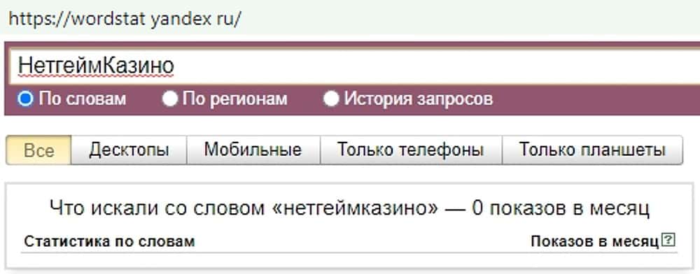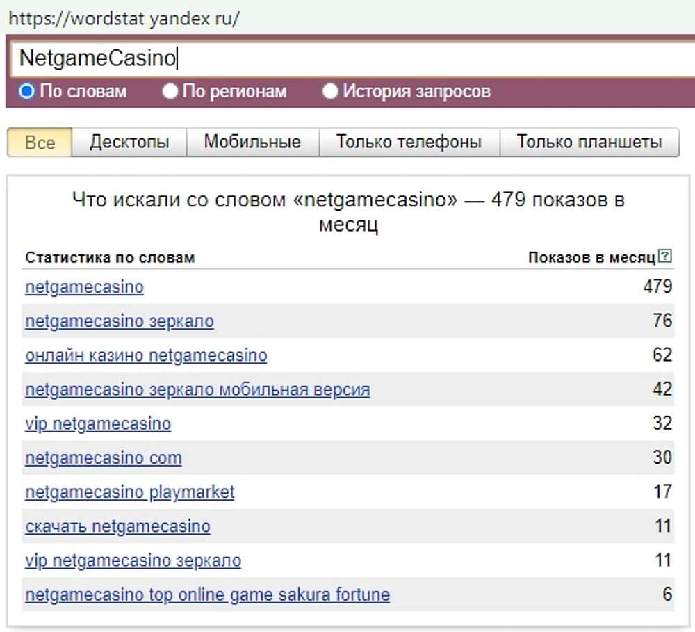 Намного меньше пользователей поисковой машины Яндекс, заинтересовал вариант с написанием мошеннического бренда "NetgameCasino". Его искали всего лишь 479 раз за месяц.