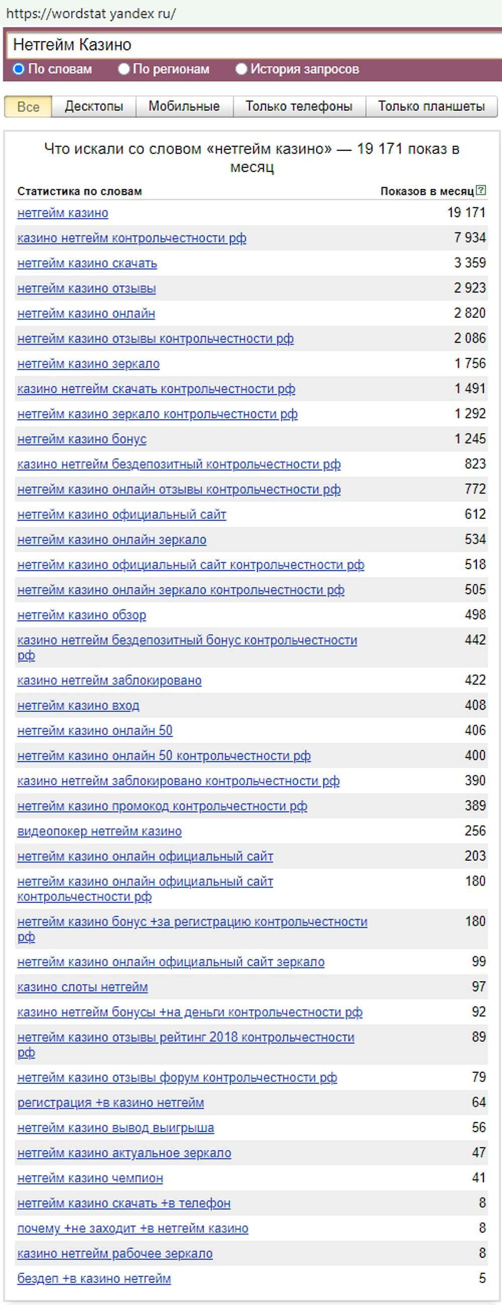 Рекордное количество заинтересованных в поиске болотного игросервиса вводили в строку поиска запрос "Нетгейм Казино". Таких запросов к Яндекс было 19171, что довольно не мало.