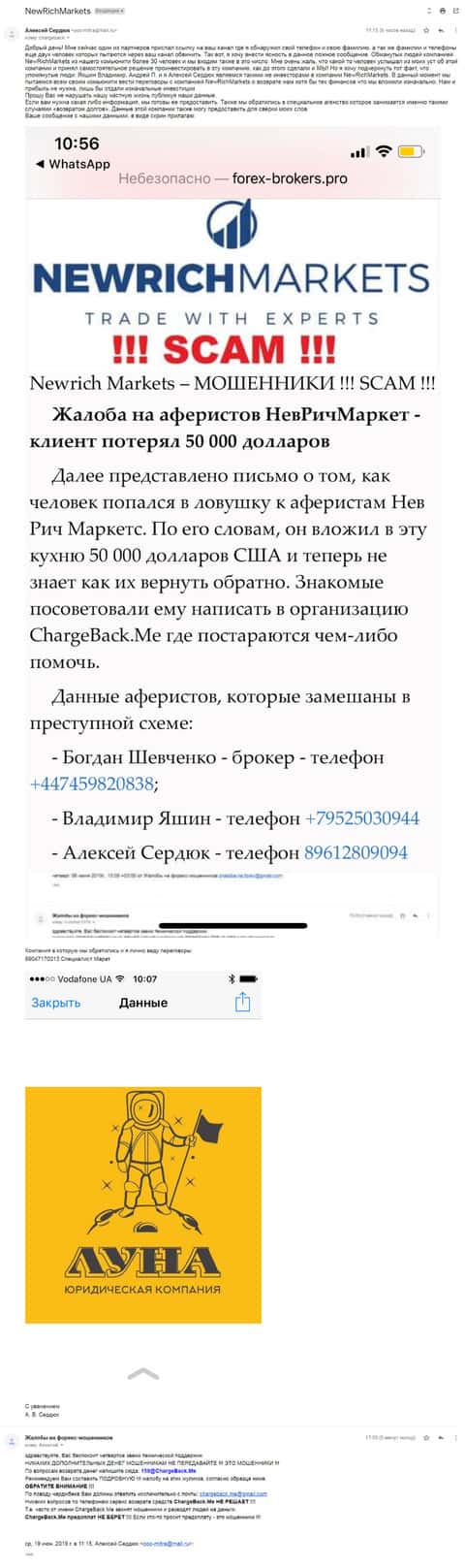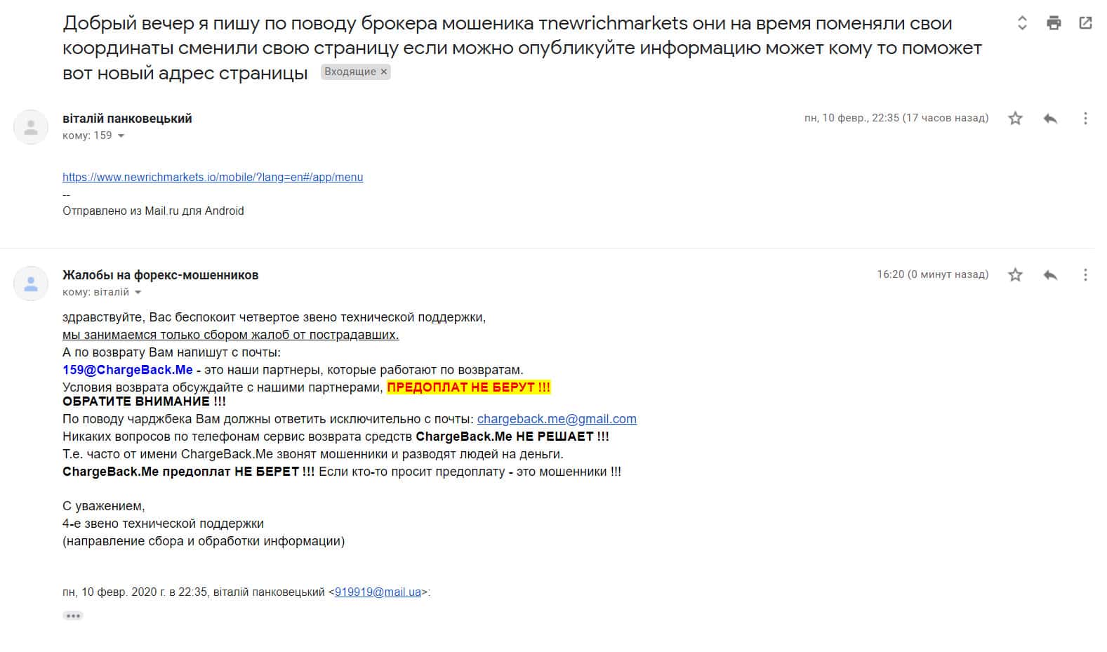На емайл интернет-сервиса, разоблачающего деятельность жульнических организаций в сети Интернет, пришло письмо с очередной жалобой на фальшивого брокера Newrich Markets, обманутый пользователь всемирной сети вероятно желает вернуть свои утраченные деньги, и в этом скорее всего ему помогут юристы-партнеры данного информационного сайта.