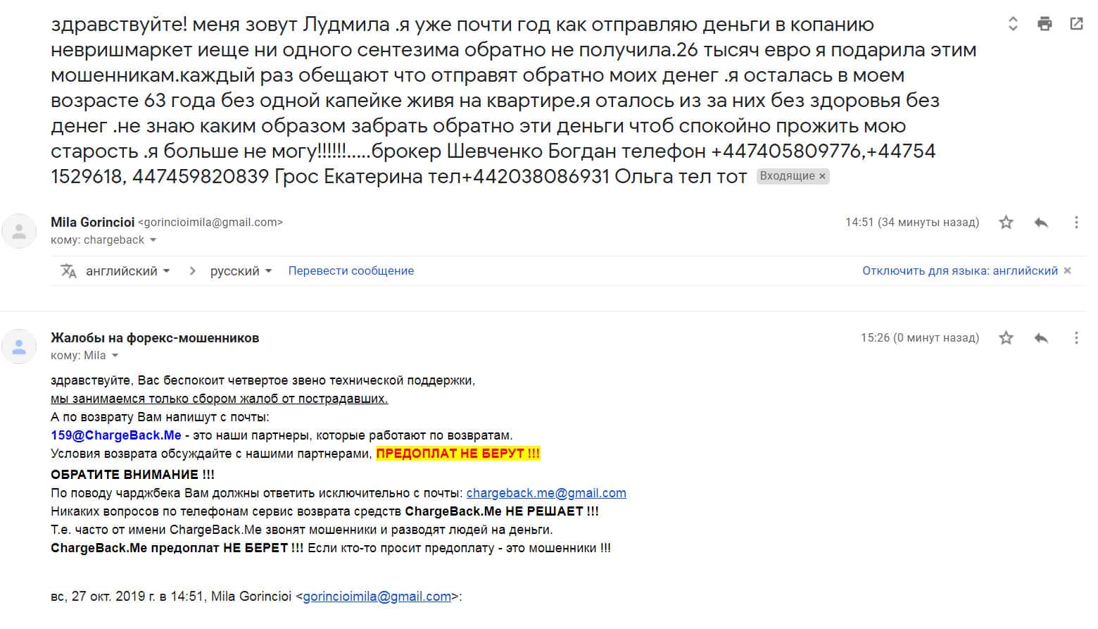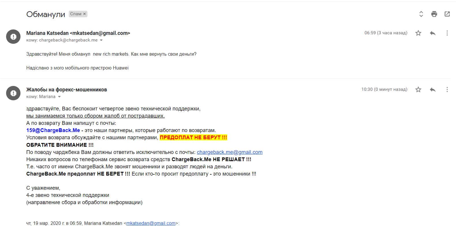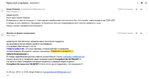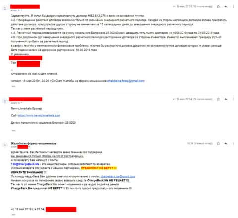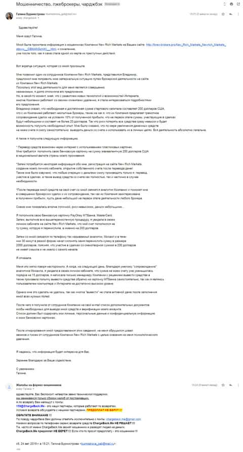 Гнусные психологи их форекс-конторы Нев Рич Маркетс обработали еще одного человека, у которого выманили 200 долларов. Плюс ко всему они еще и требуют отправить скан всех документов жертвы, якобы тогда они смогут вывести деньги. Он все сделал, но жулье перестало отвечать на звонки и письма. Во всем пришлось разбираться компании ChargeBack.Me которая решает такие вопросы на раз.