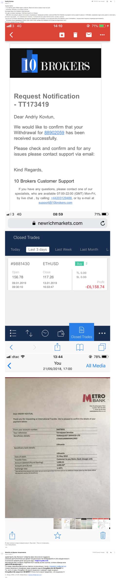 Еще один печальный случай произошел с человеком, который связался сразу с двумя лохотронами и потерял огромную сумму денег. Сначала он инвестировал 9 000 евро в кухню 10 брокерс, которая по итогу слила его счет. А потом решил испытать удачу в конторе Newrich Markets и потерял свыше 6000 фунтов. Теперь вариант разрулить только, обратившись в организацию ChargeBack.Me