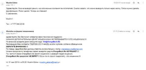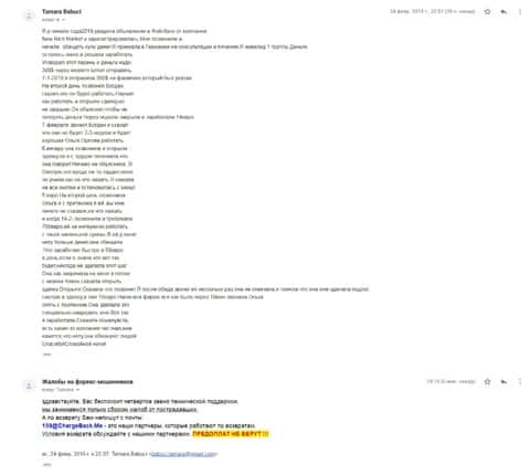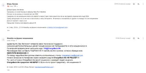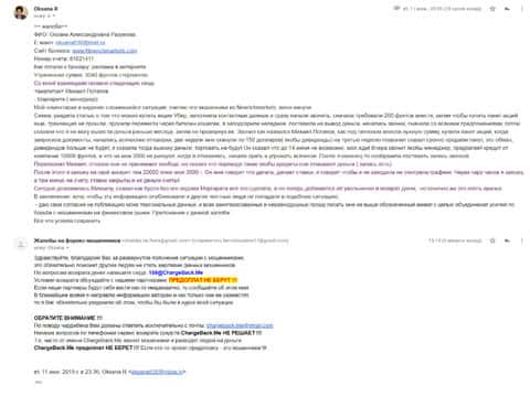 Очередной клиент повелся на доводы звонарей из форекс-организации Нев Рич Маркетс и вложил порядка 200 евро. Поначалу шарлатанам этого хватало, но уже спустя пару дней, они стали выпрашивать вложить еще 2000 евро. После этого наглежа, клиент написал подробную жалобу в интернет-компанию ChargeBack.Me где работают высококвалифицированные специалисты и знают как выйти сухим из этой неприятной ситуации.