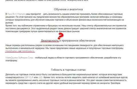 Сайт, даже, предлагает торговлю, не только на самой популярной платформе MetaTrader 4, но и на MetaTrader 5. Чего только не сделаешь для лоха, ведь доходы от обмана для них будут уж гораздо больше стоимости покупки ими указанных программ. Человек посмотрит и почитает такие фразы и может даже клюнуть на уловки шулеров Newrich Markets. Поэтому не верьте тому, что пишут, даже на таких, на первый взгляд, качественных сайтах.