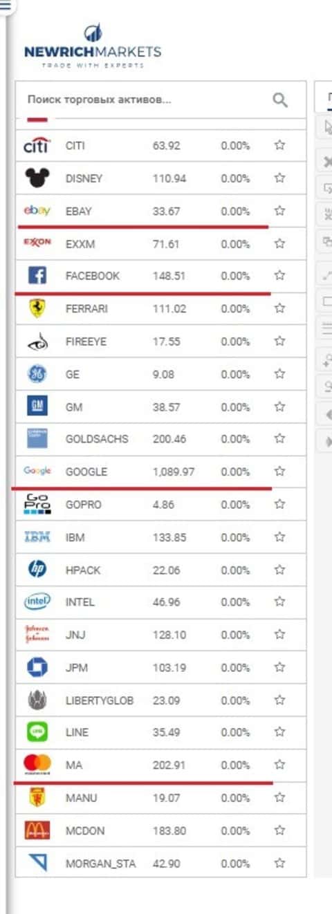 Заметим, что в разделе "поиск торговых активов" вообще не просматриваются суточные изменения таких активов как облигации, товары и индексы. Поэтому сразу понятно, что денег форекс-конторе Нев Рич Маркетс на программиста не хватило. Наметанный глаз заметит это и убежит от этой шараги, а вот новичек пропустит и попадется на такие названия как Ebay, Facebook, MasterCard, Google и прочее.