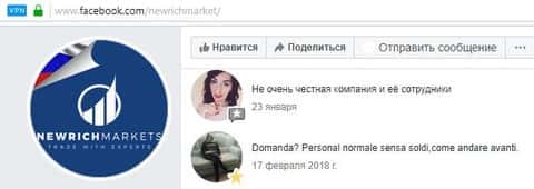Как сообщила нам одна девушка, которая уже сталкивалась с дилинговой форекс-кухней Newrich Markets, эта шарага достаточно не честно работает, тем более, что ее сотрудники хамят и не компетентны в ряде вопросов. Скорее всего аферисты кинули ее на деньги, если она даже не побоялась написать отзыв у них в группе в Facebook. Поэтому она настойчиво не рекомендует связываться с мошеннической организацией Нев Рич Маркетс ради своего же блага.