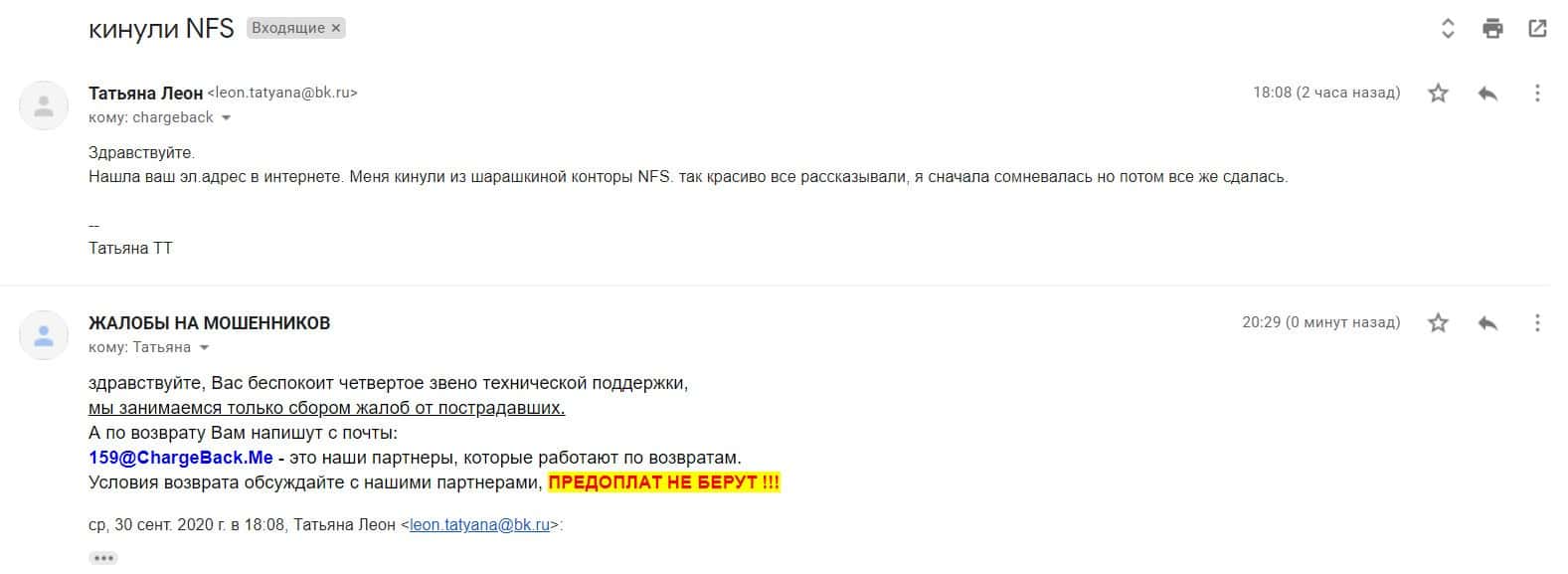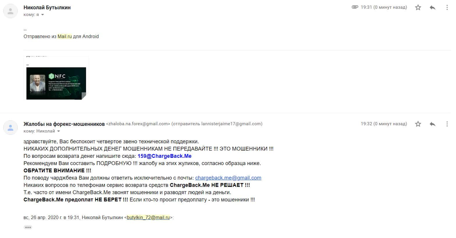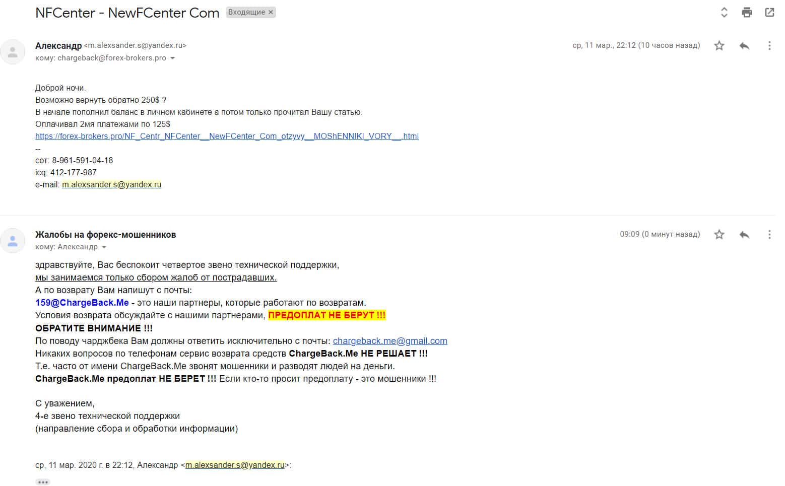 Далее вы можете увидеть скриншот письма, где указывается, что шарлатанская организация NFCenter, ворует деньги у клиента. Также предоставлена реальная информация об одном из жуликов, который как раз и занимается разводом. Хотя обычно аферисты выставляют публично левую информацию о себе. Теперь по порядку: