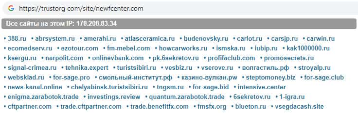 Так же на веб-сайте трусторг ком отыскана информация о том, что домен сайта брокерской конторы NewFCenter Com находится на одном ip-адресе с сайтами различных интернет-магазинов, онлайн-казино, а так же с уже давно неработающими сайтами. Следовательно доверять скам-конторе НФ Центр нельзя !!!