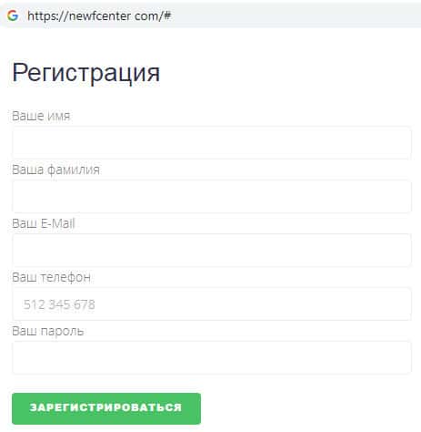 Для того, чтобы зарегистрироваться на сайте мошенников NFCenter необходимо назвать свое имя, фамилию, адрес электронной почты, контактный номер телефона и пароль. Зарегистрировавшись Вы автоматически соглашаетесь с условиями пользования сайтом. Прежде чем регистрироваться на сайте аферистов НФ Центр, подумайте стоит ли так рисковать своими деньгами?