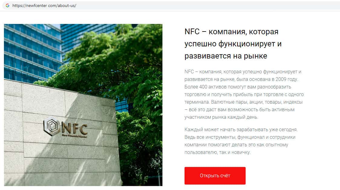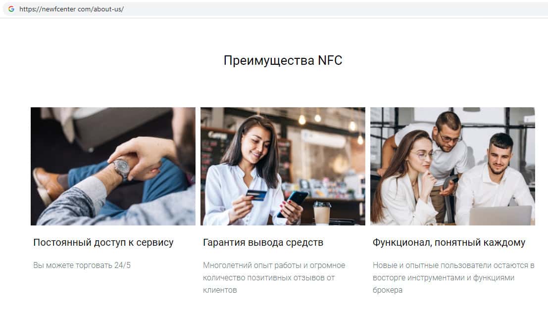 Официальный интернет-ресурс брокерской конторы NFCenter практически ничем не отличается по своему содержанию от сайтов других скам-брокеров. Сайт мошенников НФ Центр приукрашен картинками из интернета, а так же лживыми неправдивыми обещаниями о якобы возможности получения прибыли, верить которым категорически нельзя !!!