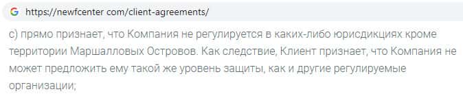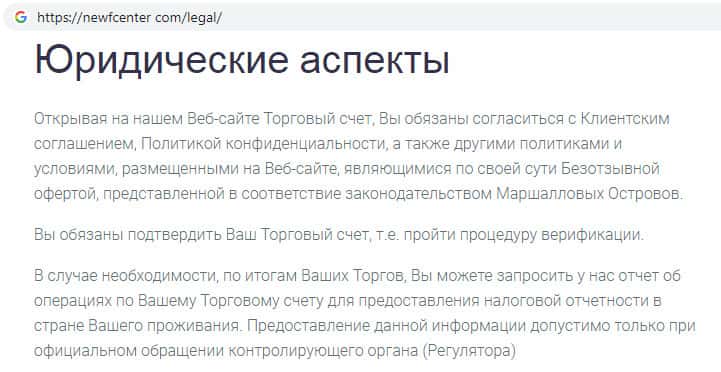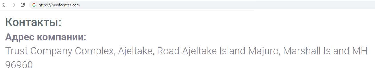 Мошенническая организация NewFCenter имеет оффшорное место регистрации а именно зарегистрирована на Маршалловых островах, что является показателем того, что компания не подходит для граждан РФ. В случае утраты Вами денежных средств Вы ничего не докажете и не сможете вернуть деньги.