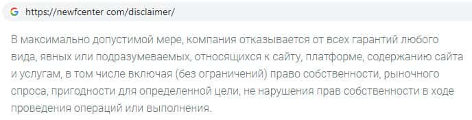 Отказ от ответственности на сайте жульнической конторы NewFCenter