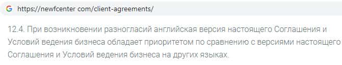 Мошенники NewFCenter утверждают, что английская версия предоставленной документации на их сайте более достоверная, чем на русском. Мы уверенны в том, что это очередная мошенническая уловка, которая придумана для того, чтобы не нести никакой ответственности за написанную информацию, ссылаясь на возможные ошибки.