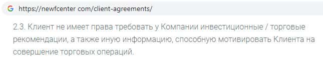 В клиентском соглашении аферистов НФ Центр обнаружена информация, которая противоречит той, что указанна на официальном сайте аферистов. Оказывается скам-компания NewFCenter Com не имеет права мотивировать своих клиентов торговать на их сайте, что они постоянно демонстрируют и идут против прописанных правил.