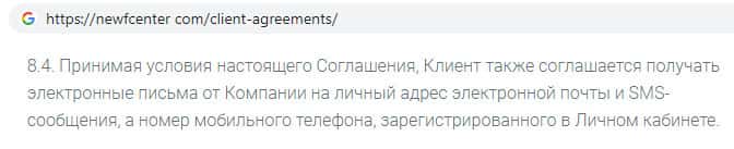 Принимая условия пользовательского соглашения предоставленного на сайте NewFCenter Com приготовьтесь к тому, что аферисты начнут назойливо рассылать сообщения рекламного характера на телефон, а так же на электронную почту. Так же мошенники НФ Центр таким образом заставляют пользователя взять кредит на их сайте.