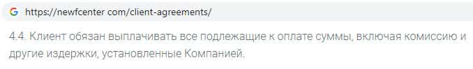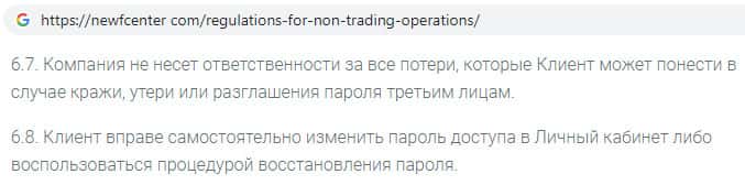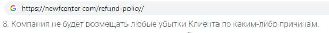 Мошенники NewFCenter не за что не несут ответственности, в особенности за результаты торговли на их дырявом сайте. В результате такой торговли на сайте зарегистрированный пользователь зачастую остается ни с чем, поскольку аферисты НФ Центр не гарантируют какую-либо прибыль, заранее прописав все необходимые пункты.