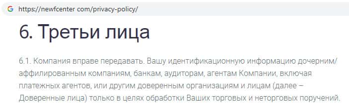 Мошенники НФ Центр передают информацию третьим лицам о клиенте. Это в свою очередь означает, что о конфиденциальности в таком случае не может быть и речи. За распространение личной информации аферисты NewFCenter ответственности конечно же не несут, перекладывая всю ответственность на клиента.