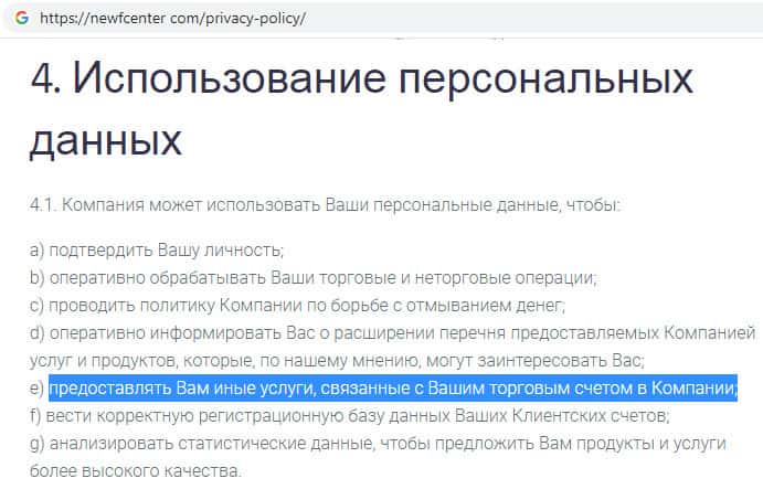 Жулики NFCenter пишут о том, что их компания может использовать персональные данные клиента, чтобы предоставлять иные услуги, связанные с торговым счетом компании, но какие именно не указывают. Вероятнее всего это может быть предложение взять кредит. В итоге такой торговли на сайте аферистов НФ Центр клиент может остаться с долгами.
