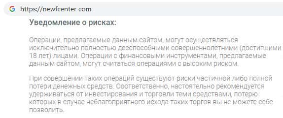 - Уведомление о всевозможных рисках на сайте скам-брокера NFCenter