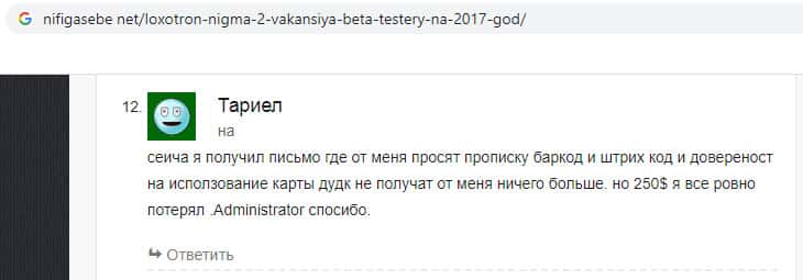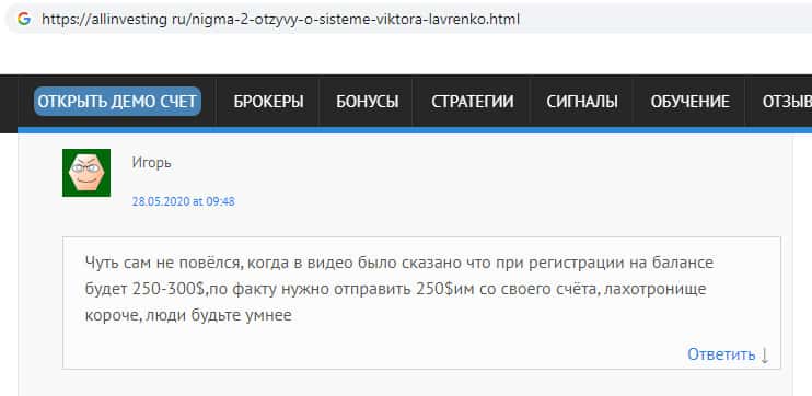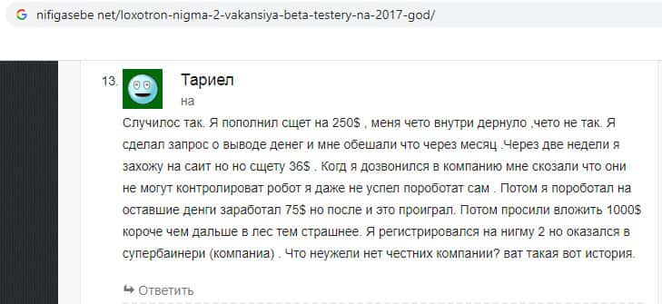 Данный отзыв написал один из пользователей и посвятил его компании мошенников Нигма 2. В нём он указал, что сам чуть не стал жертвой мошенничества, так как почти повёлся на уговоры компании, особенно его привлекло предложение о том, что при регистрации он получит 250 долларов на счёт, но оказалось, что эти деньги он сам должен внести на счёт компании.