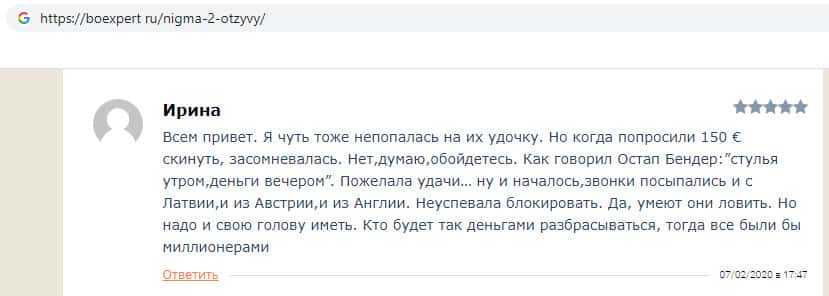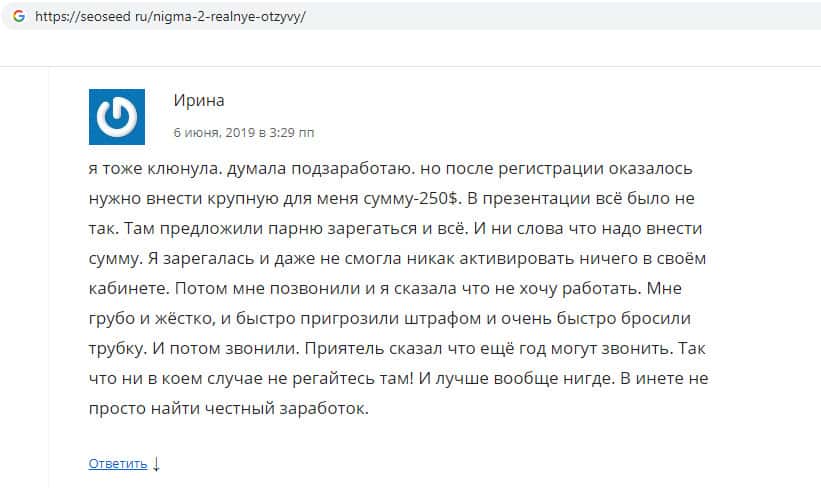 Некая Ирина написала отзыв о сотрудничестве с компанией кидал Нигма 2. В нём она рассказала как попала в руки мошенников. Она зарегистрировалась в компании, но оказалось что нужно внести 250 долларов, что для неё большая сумма, и она отказалась, после чего ей начали звонить и грубо угрожать штрафом, пытаясь надавить на пользователя.