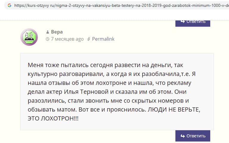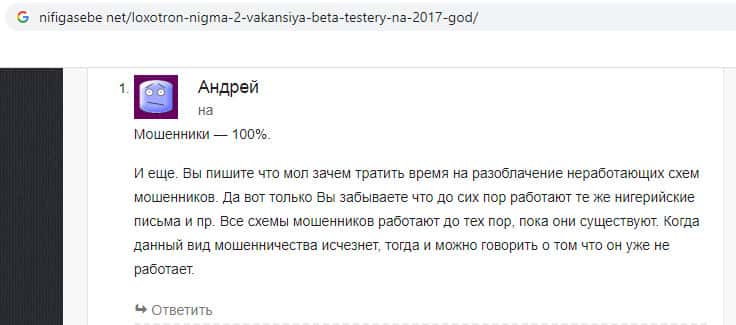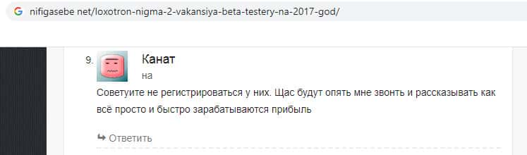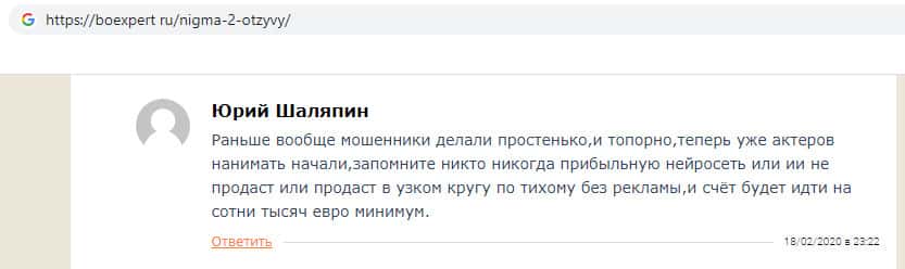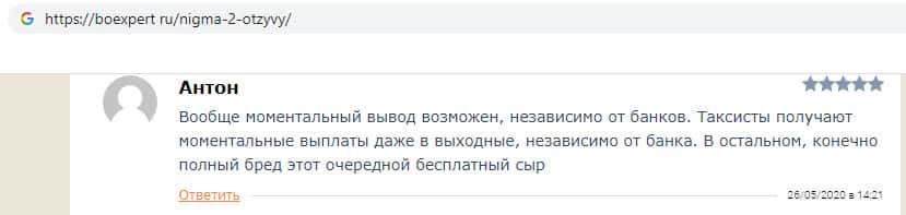 Пользователь в своём отзыве о компании кидал Нигма 2 написал, что они сто процентные мошенники. так же он возразил против пользователей, которые говорят о том, что разоблачительные статьи не нужны. Он добавил, что если бы не эти статьи, то аферисты Нигма 2 развели ещё больше людей, и отобрали бы чужие деньги и остались бы безнаказанны.