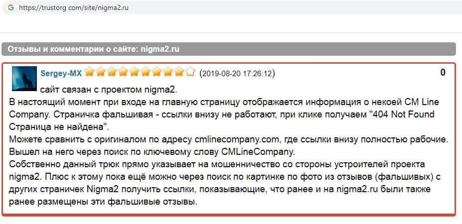 Мнение сайта Доверие в Сети о мошенниках Нигма 2