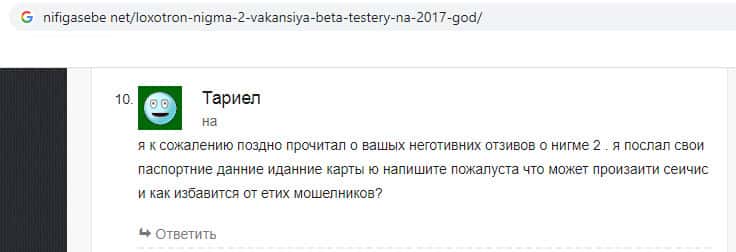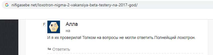 Далее на скриншоте предлагаем ознакомится с информацией в виде жалобы на аферистов Нигма 2, которые занимаются откровенным разводом, но человек вовремя узнал о том, что они мошенники, поэтому не стал с ними связываться.