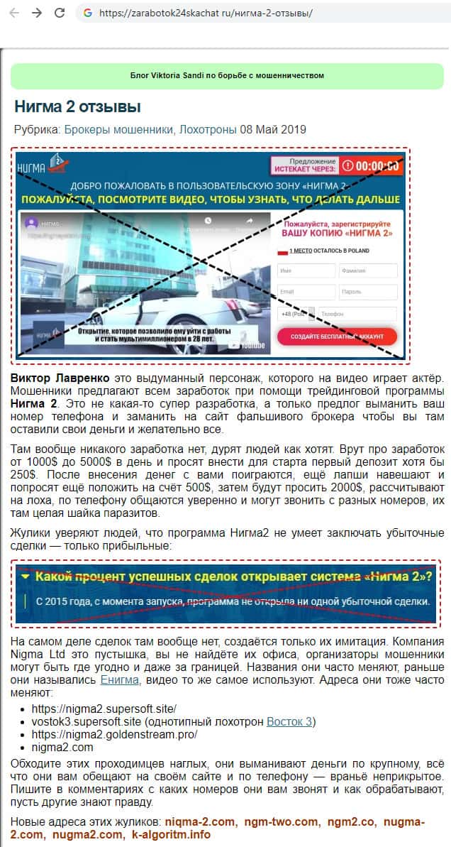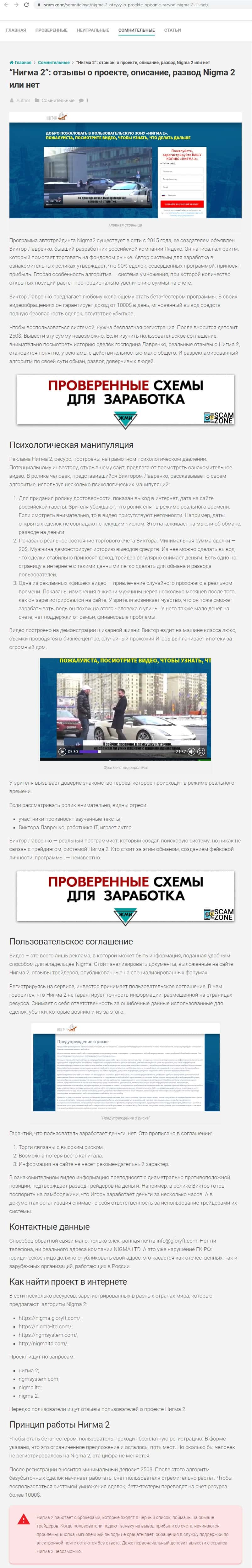Интернет ресурс scam zone опубликовал статью. в которой разоблачает мошенников Нигма 2. В ней компания рассказывает, как мошенники разводят людей. Они заставляют регистрироваться на сайте, а затем счёт клиента стремительно растёт, и что бы преумножить его компания предлагает внести 1000 долларов, после чего пользователь не видит ни свой депозит, ни дополнительную 1000.