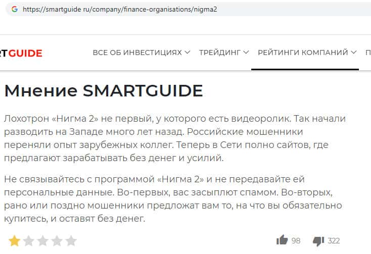 Данный отзыв посвящён одной из разоблачительных статей, которые были написаны с целью обезопасить пользователей от мошенников Нигма 2. Пользователь назвал ролик компании кидал пафосным и плохо сыгранным. Так же он не понимает, как люди могут на токое вестись, и в недоумении от того, что создателям его не стыдно за то, что они так подло разводят людей.
