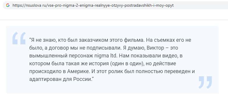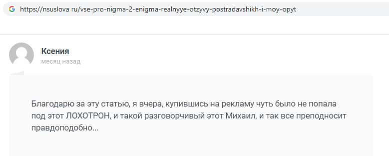 А вот и пример того, как данная статья помогла пользователям. В комментарии к этой заметке человек написал, что сам чуть не повёлся на уговоры компании, ведь предоставленный мошенниками Нигма 2 видео ролик был очень внушительным. Но прочитав статью, пользователь понял, что ошибался и на самом деле это настоящие махинаторы.