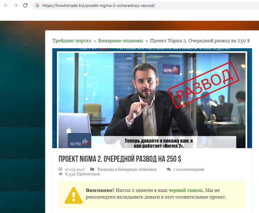 Нам удалось найти информацию о мошеннической конторе Нигма 2 на сайте хавтутрейд биз. Оказалось, что компания аферистов занесена в чёрный список, и по мнению сайта не рекомендуется вкладывать деньги в этот проект. За время своего существования компания уже попала в чёрный список, что о многом говорит.
