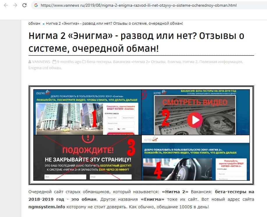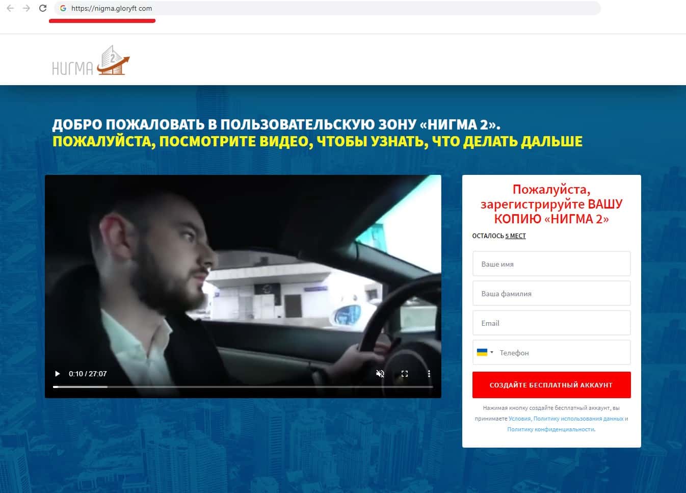 На сайте смартгид ру мы нашли информацию о том, что компания кидал Нигма 2 научилась разводить людей с помощью видеороликов у зарубежных мошенников. Там такой вид мошенничества процветает уже давно, теперь и у нас многие компании пользуются им, и именно Нигма 2 сделали один из успешнейших мошеннических проектов, основанном на этом способе.
