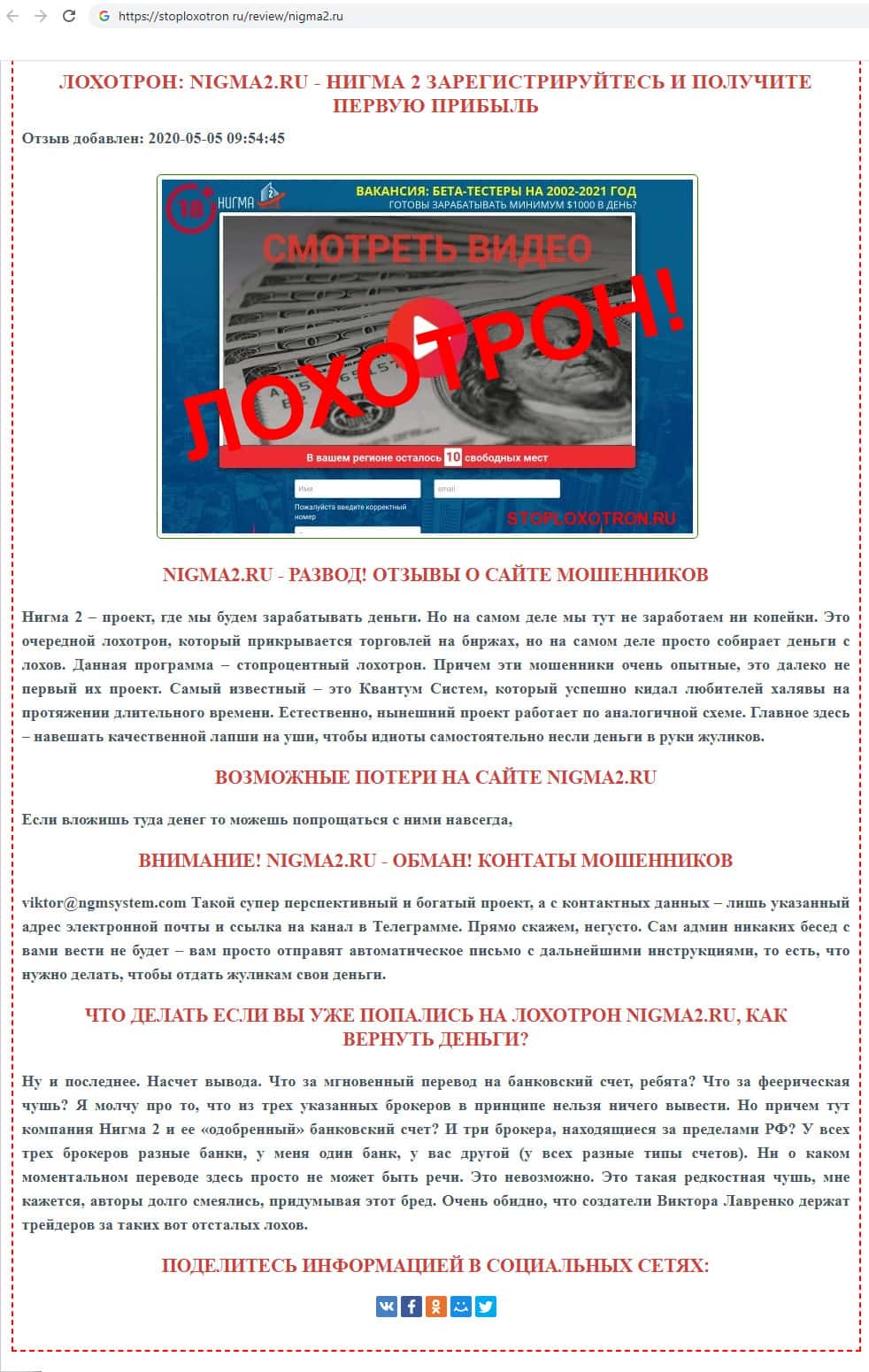 Один из сайтов который разоблачает финансовых мошенников stoploxotron ru добрался и до лохотрона Нигма 2. В статье он рассказал о мошенниках и о том как они разводят пользователей. Так же он предупредил ни в коем случае не связываться с компанией кидал, что бы избежать потери денежных средств.