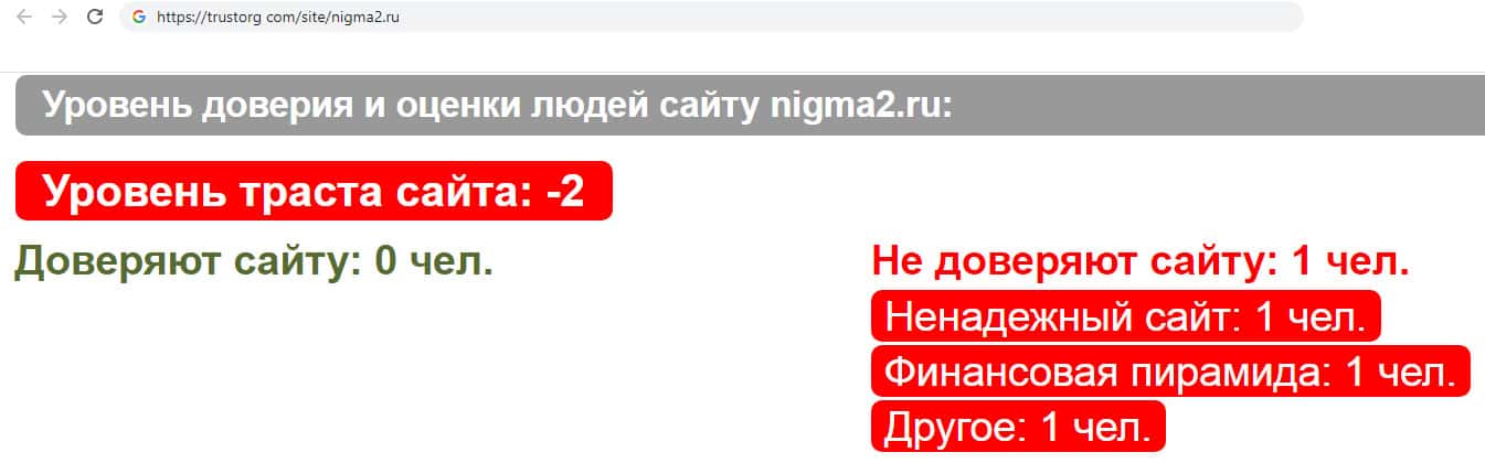 Мы проверили интернет ресурс мошенников Нигма 2 через сайт "Доверие в Сети", и выяснилось что сайт аферистов обладает отрицательным уровнем доверия. Компания подозревается в мошенничестве, также её считают финансовой пирамидой. Компания видимо обманула много пользователей, что бы заслужить место на этом сайте с такой оценкой уровня доверия.