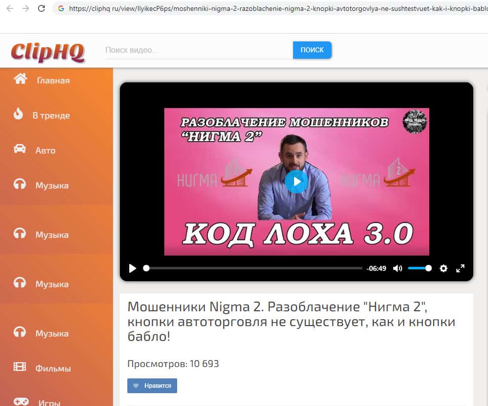 В поисках информации о жуликах Нигма 2 мы наткнулись на сайт cliphq ru, на котором было опубликовано видео разоблачение фирмы разводил. В этом видео автор подробно рассказал о компании и как она незаконно зарабатывает деньги, и о том, как они сделали поддельное видео, которое привлекает наивных пользователей.