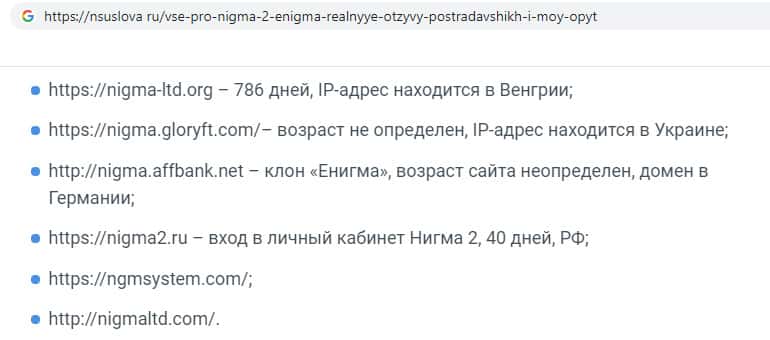 Нам удалось найти информацию о том, что на просторах интернета существует не один сайт конторы разводил Нигма 2. Данная компания имеет много доменов, видимо на одном они соскамились, и перешли на другой, что бы не закрывать свою мошенническую деятельность. Именно из за невнимательных пользователей компании удаётся наживаться на чужом горе.