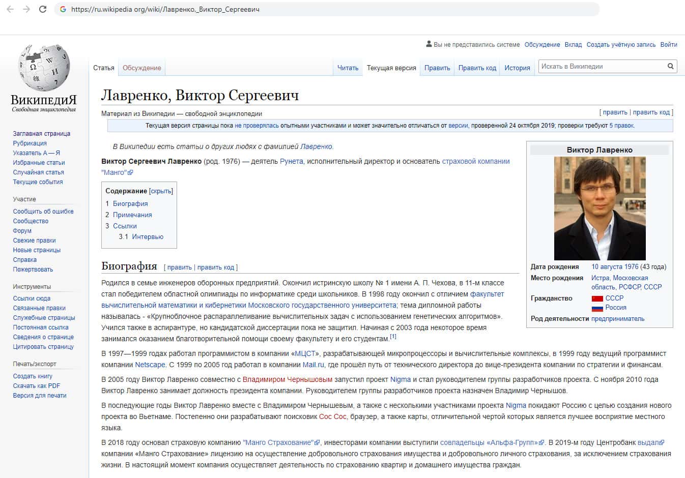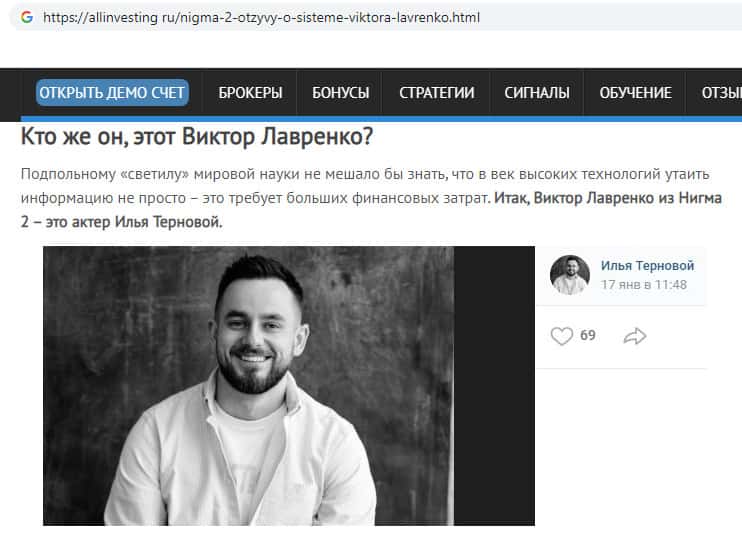 А вот перед вами настоящий Виктор Лавренко, который действительно создал проект под названием Нигма, но с мошеннической компанией он не имеет ничего общего. Его проект является поисковой системой. Как мы видим между настоящим и поддельным виктором нет ничего общего, просто мошенники воспользовались известным именем и названием проекта.