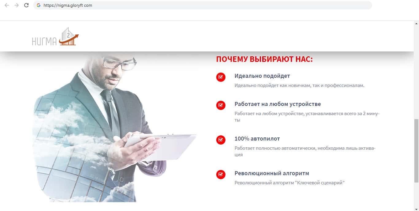 Далее на сайте аферистов Нигма 2 представлен раздел с информацией о том, почему пользователь должен выбрать именно эту компанию. Жулики указали, что она подходит для новичков и имеет полный автопилот, что очень сильно притягивает внимание неопытных пользователей, который думают, что смогут так легко заработать много денег.