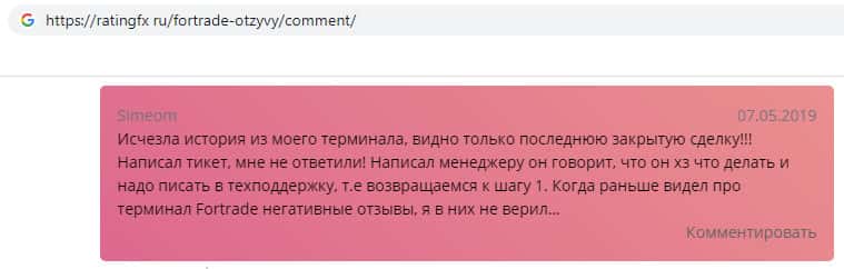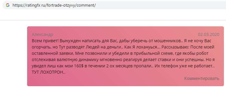В сети нам удалось найти отзывы пользователей, которые очень хорошо характеризуют компанию разводил ForTrade. Например в этом отзыве пользователь рассказал, как его кинула компания, убедив его в программе, в которой робот сам будет отслеживать успешные сделки и делать ставки. В итоге пользователь лишь заметил как его счёт за пару месяцев слился.