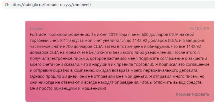 Так же фирма ForTrade обманула клиента на 600 долларов. Пользователь за месяц увеличил свой депозит в двое, после чего запросил частичный вывод средств в размере 700 долларов, но компания просто заблокировала его счёт и обвинила в мошенничестве, заставив подписать документ в котором он согласился с обвинением, ему обещали вернуть первоначальный депозит, но так ничего и не вернули.