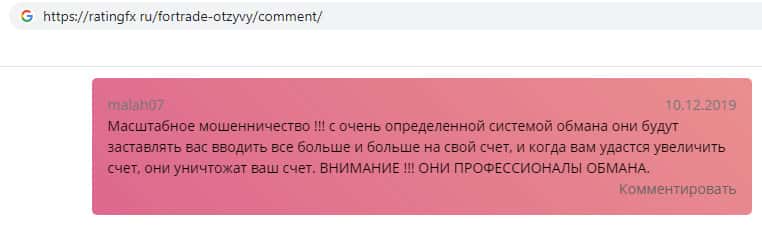 А вот в этом отзыве пользователь назвал компанию кидал ForTrade - масштабным мошенничеством, так как компания очень хорошо манипулирует пользователями заставляя их инвестировать всё больше и больше, а как только клиенты начнут зарабатывать то компания просто напросто их полностью уничтожит.