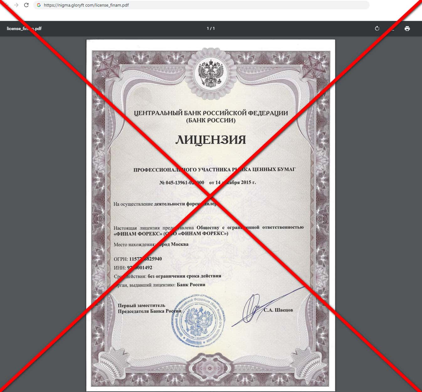 Фальшивая лицензия фирмы финансовых мошенников Нигма 2