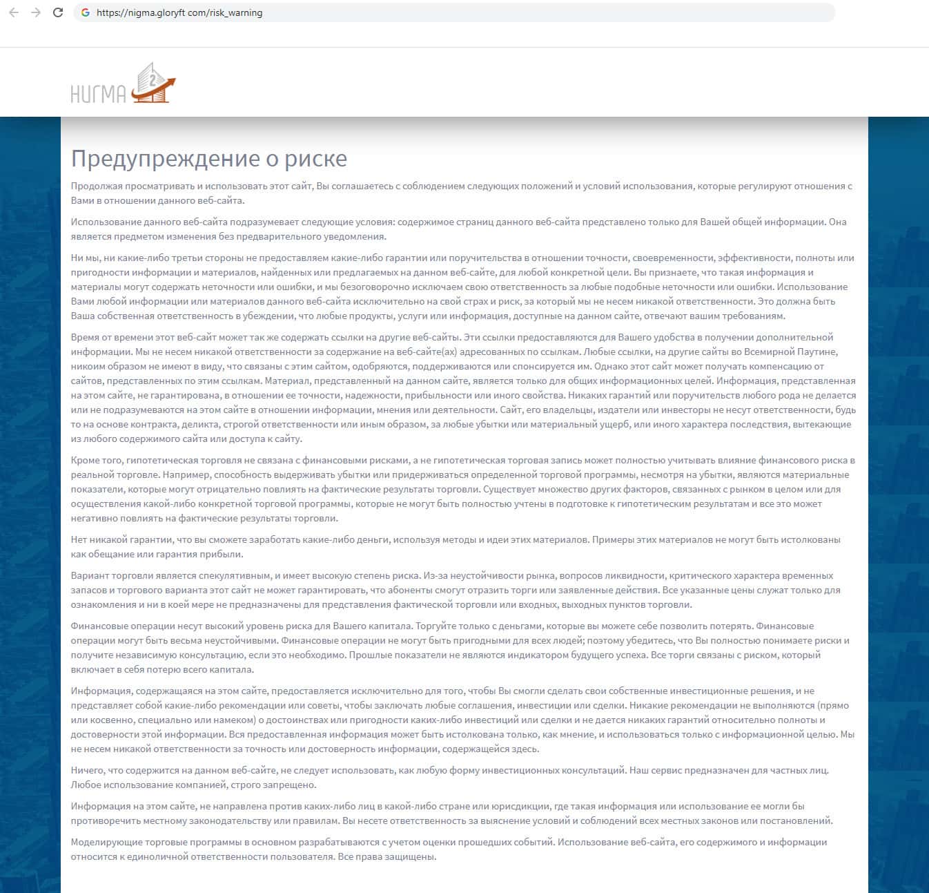 На главном интернет ресурсе компании кидал Нигма 2 есть документ "Предупреждение о рисках", в котором компания говорит о том, что не несёт ответственности за потери средств клиентов, так как торговля несёт за собой огромные риски, но в тоже время на сайте они указывают, что пользователь ничем не рискует и смело может доверится автопилоту.