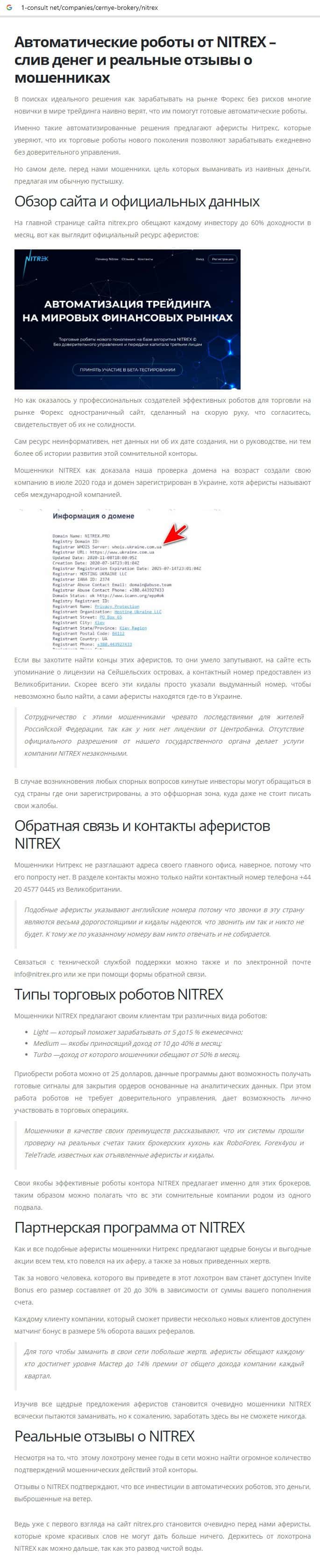 Nitrex Pro - очередной мошеннический онлайн-сервис, который якобы дает возможность получать пассивный доход, торговля на финансовых рынках осуществляется с помощью роботов, которые судя по пользовательским отзывам сливают депозиты клиентов, система оптимизирована для торговли на платформе Meta Trader 4, которая разработана скам-компанией Мета Куес для слива денежных средств клиента, аферисты работают в одной связке с брокерами-мошенниками RoboForex, Forex4you и TeleTrade (ТелеТрейд), обманщики скрывают информацию о руководстве, а также о местонахождении компании, поводом для написания статьи послужила жалоба о том, стоит ли связываться с шулерами Nitrex. Не рекомендуем регистрироваться на сайте обманщиков Нитрекс !!!