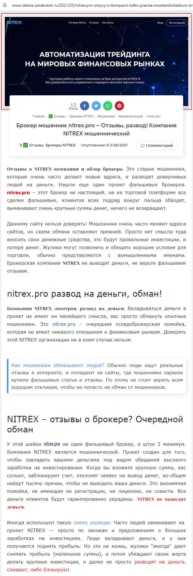Шулера Nitrex на своем сайте рекламируют псевдо-брокерские организации, среди которых шарага RoboForex, которая разводит пользователей на немалые суммы денежных средств.